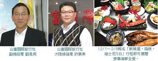 山富國際旅行社今年春節經營日本線依舊以東京、大阪、名古屋、九州、北海道為主軸,向外推展行程。山富國際旅行社副總經理劉見明表示,「今年操作日本線的行程依舊是以班機的航班做為操作的基礎,東京線寒假推出5、6、7天的行程,從1月開始,一直持續到2/8,『東京5天』的行程以新鳩屋為主打內容,新鳩屋位於遠近馳名的伊東溫泉區,曾經榮獲伊東溫泉飯店排名第一,更曾是日本皇室御用的溫泉休閒旅館,由於溫泉區屬於弱鹽化溫泉,因此具有舒緩神經痛、五十肩的功能,山富國際旅行社對於旅行東京的遊客給予相當好的餐食,凡是除夕或初一入住新鳩屋A山富國際旅行社提供海鮮全餐的升等服務,旅客不需額外加錢,就可以享用豪華海鮮全餐。」