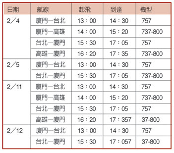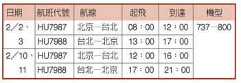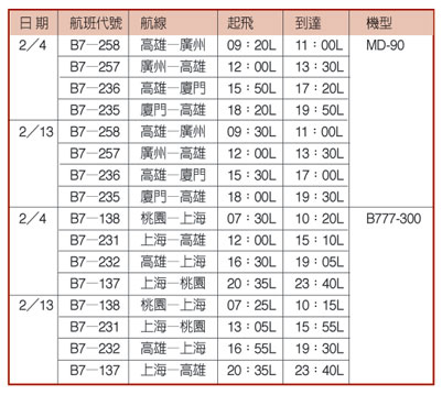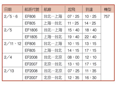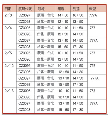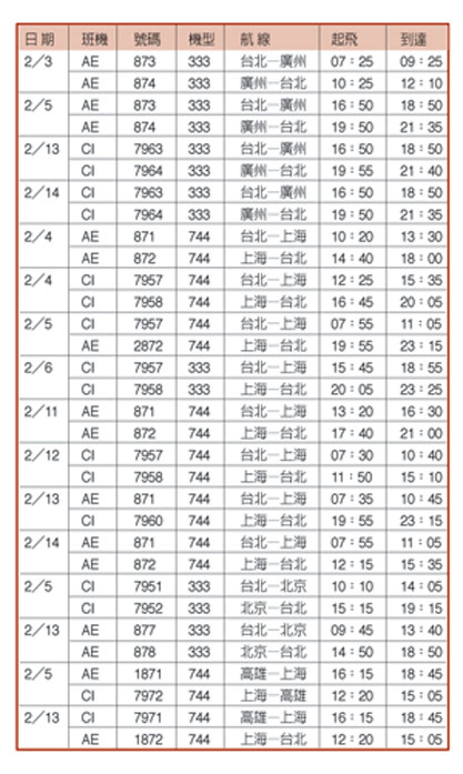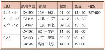 隨著農曆春節將近,華航/華信2008兩岸春節包機所規劃航班時間已出爐,還可搭配正班機安排進出行程,華航台北分公司客運營業部香港/大陸/菲律賓主任李建勳指出,目前已規劃台北—廣州4班、台北—上海8班、台北—北京2班及高雄—上海2班,共16班。在北京方面,可包裝9天行程,2/5去、2/13回為最佳模式;上海則可規劃8天或9天的團體行程,最為熱門的時段為2/6出發、2/11回程的6天行程,因此票價比9天貴6,000元左右;廣州5天,票價約5,000元。