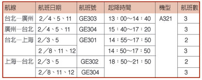 復興航空營運處行銷部經理楊靜儀指出,今年復興在包機的規劃主要以因應台商返鄉過年的需求為主,區位選擇則將主力放在華南以及華東地區,在廣州部分於2/4、5、11來回各有3班航班、上海則是於2/3、5、8、11、12來回各有5班航班,由A321機型飛航,並同時有商務艙以及經濟艙的不同選擇。 (撰文>蔣德誼 )
