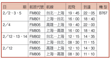 上海航空定於2月2日至2月14日期間提供春節包機服務,將提供上海—台北、上海—高雄各6、2個來回航班。由於上海是台商聚集重鎮,當地台商一早即頻向上海航空各分銷據點詢問,上海航空方面則擴大銷售據點,在長三角地區十數個據點銷售,據了解截至目前為止銷售狀況頗佳。機隊方面,為滿足廣大旅客需求,上海航空以大型767客機派飛。(撰文>曾瑋琪)