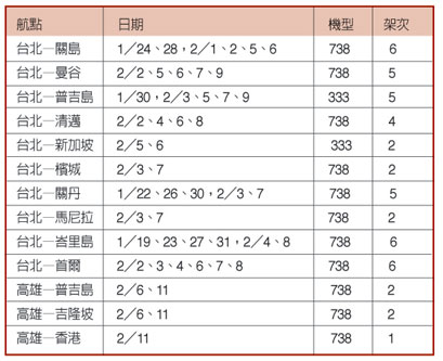 中華航空因應今年春節假期只有6天為短天數,除了炙手可熱的日本線外,特別規劃東南亞航點的加班機及包機,除了從台北出發的航點,高雄出發則規劃普吉島、吉隆坡及香港等3航點,以利業者包裝相關行程,北高出發總計48架次。(撰文>呂雪芳)