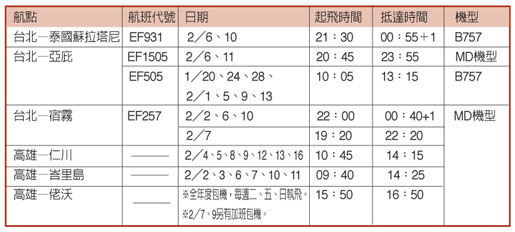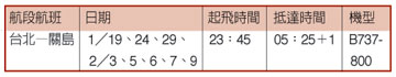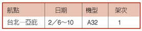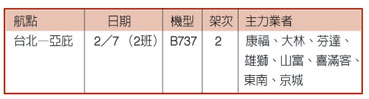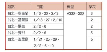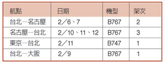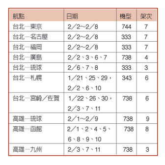 日亞航台北分公司旅客業務部經理方曼麗表示,因應旺季旅客的航班需求,日亞航今年在春節檔共推出7班加班機,在名古屋航線部分包括2/6、7由台北飛往名古屋2班,以及2/10、11、12由名古屋回台北的3個班次,另外2班則是2/9由台北飛大阪,以及2/11由東京回台北的航班。(撰文>蔣德誼)