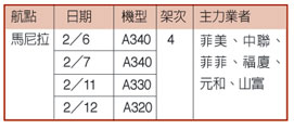 華信航空在宿霧方面,推出台北—宿霧為4/5天一串,載客約8成左右、高雄—宿霧則達9成。全部共7架。 (撰文>呂雪芳)