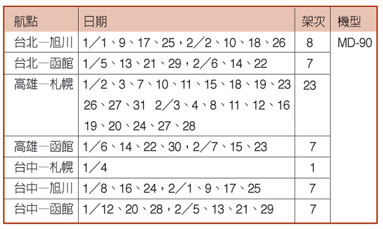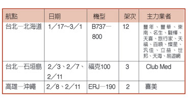華信航空針對北高二地出發,規劃北海道、沖繩、石垣島等包機及加班機,華信航空營業部營業經理周育志指出,為了提供業者更充足的機位,在運能調度平衡的狀態之下,特別加開加班機及包機。因應市場需求特別規劃高雄—沖繩包機,以日本旅客來台觀光為主。在台北—北海道部份,共12班,5天一串,以函館、旭川、釧路、帶廣及女滿別等交叉進出,目前預估已達9成載客率。(撰文>呂雪芳)