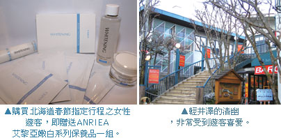 新台旅行社行銷部協理廖恭德表示,即日起凡購買日本北海道春節期間網購指定團體行程的女性遊客且年滿18歲,即贈送ANRIEA艾黎亞嫩白系列保養品一組,皆為市場銷售正品,絕非市面旅用試用包。