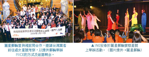 麗星為了讓台灣旅行業者更加了解郵輪舉辦MICE的方式及創意概念,也曾與港旅局合作邀請近80名業者前往處女星號,藉此傳達跳脫以往岸上活動的方式,可在海上利用郵輪上任何軟硬體資源,創造出與眾不同的回憶。