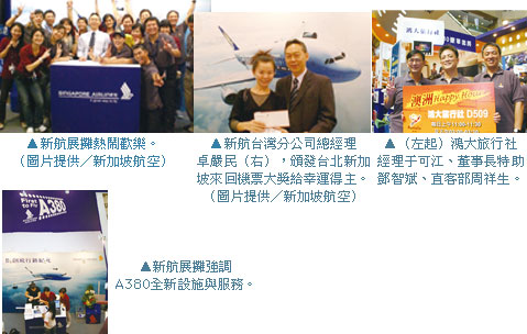 新航台灣區總經理卓嚴民積極向大家推薦新航A380與貼心服務,希望藉者以A380為主題的設計加強新航帶給旅客的完美形象。為回饋訂購套裝行程並預付訂金的旅客,新航設計了頂級加碼大抽獎活動,於旅展最後一天下午抽出,最大獎項為新航獎勵計劃會員飛行哩程50,000哩1名,可兌換台北至澳洲5航點任1航點經濟艙來回機票1張。