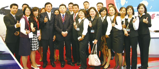 ▲ 山富國際旅行社董事長陳國森(中間打紅領帶者)及總經理吳再裕(前排左4)率領同仁們到航空公司攤位拜訪。