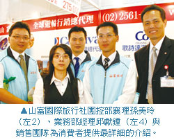 山富國際旅行社於旅展期間針對長程線及短程線皆有許多優惠行程,郵輪系列產品更是主打產品,而泰國、韓國、峇里島、馬來西亞、日本、大陸等產品也皆規劃比市價便宜近2,000~f0 3,000元好康行程,其中韓國5日加贈亂打秀只要9,800起。泰魅力6日只要5,600起、曼谷自由行6日7,500起,以及只要4,900起的行程包含香港3日、港澳雙星4日、桂林印象5日、昆大麗8日、張家界6日等產品,皆深受消費者的喜愛,讓今年度業績成長不少。