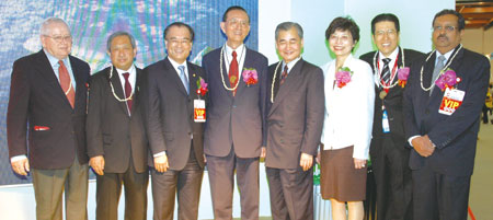 ▲ ITF開幕首日,主辦單位邀請之貴賓特別蒞臨長榮展攤。(左起)尼加拉瓜觀光部部長Mr. Mario Salinas、日本觀光協會會長中村徹、長榮航空公司總經理鄭光遠、行政院副院長邱正雄、交通部部長毛治國、觀光局局長賴瑟珍、台北國際旅展主任委員嚴長壽、印度-台北協會會長史泰朗。
