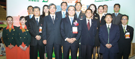 ▲ (前排左3起)長榮航空客運本部營業部協理蔡銘芳、立榮航空總經理陳憲弘、長榮航空總經理鄭光遠、長榮酒店國際連鎖旅業本部副總經理駱鴻榮、長榮航空客運本部營業部商務課課長蔡之監(前排右1);(後排左起)長榮酒店國際連鎖旅業本部協理許秉勳、長榮航空客運本部營業部營業課課長彭筱華╱營業部副理蘇偉仁╱副理潘信修、台中長榮桂冠酒店業務部副總監孫衍菁、基隆長榮桂冠酒店業務部總監黃秀娥、立榮航空客運本部台北營業部營業二課副課長李繼唐、長榮航空客運本部營業部市場作業課課長梁文龍。
