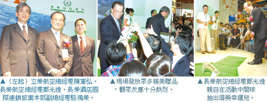 今年長榮航空在ITF展攤特別結合立榮航空、長榮桂冠酒店的展場攤位,以凸顯長榮集團的整體形象,並邀請世邦及大興等旅行社進駐,共同在現場推出多款超值優惠方案,參觀民眾在此可一次詢問包括團體以及長榮假期等多種行程,可說是相當方便。