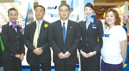 ▲( 左2~3)全日空台北支店總務業務經理辻f0 功、台北支店店長藤野未成、(右1)全日空台北支店營業部副理嚴冠玉與兩位美麗空姐合影。