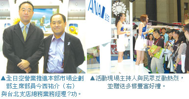 在現場活動部分ANA全日空除安排兩位日籍空姐在旅展舞台活動與現場民眾同樂「ANA元氣拳」外,舞台活動後並有填問券玩戳戳樂活動,填問券除了贈送ANA機票500元折價券及便於攜帶的口袋尺寸摺疊東京地鐵圖外,並有機會戳中東京來回機票2張的大獎!