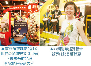 ▲ 南非聯絡辦事處郭儀倫(左)表示世足賽在南非噱頭十足,可望帶入買氣。南非館的部分展攤合作夥伴包括南非聯絡辦事處、金冠旅行社、金色非洲PAK業者、行健旅遊等,南非航空也巧妙的將企業標誌放在極為顯眼的區塊作為形象廣宣,佈置的主題呼應2010年世界盃足球賽在南非的焦點。