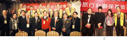 1.旅行社聯保基金互助會尾牙上除了各幹部全員到齊,更邀請到包括(前排左起)旅行公會總會執行秘書長向權宗、台北市政府觀光傳播局觀光產業科科長沈永華、台灣休閒旅館協會會長范啟敏、群英會創會會長施啟勝、台北市旅館公會理事長徐銀樹、苗栗縣政府國際文化觀光局副局長甘必通、旅館旅行業國際行銷協會理事長蘇乾亮、旺旺友聯產物保險意外險客服部經理邱隆年、品保協會副秘書長吳美惠等貴賓。2.旅行社聯保基金互助會主任委員陳松桂(右1)頒發獎金給業績最好的前三家旅行社。