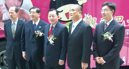 ▲ 「樂居山城.活力苗栗—北台灣觀光巴士」正式啟動,(左起)觀光局旅客服務中心主任劉文越、觀光局副局長郭蘇燦洋、苗栗縣長劉政鴻、台北市旅行商業同業公會副理事長丁萊、展笙國際旅行社行銷顧問黃正聰共同剪綵。
