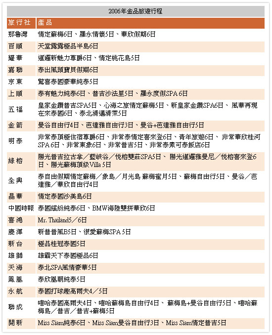 泰國觀光局台北辦事處行銷&公關經理高菱憶也表示,截至2005年旅遊品質保障薦證已推出有11年的時間,而在明年度2006的金品旅遊行程已出爐,有慶澤、新台、雄獅、天海、鳳凰、永航、聯成及開新等8家旅行社新加入金品行列,而那魯灣、百順、耀華、嘉聯、京東、上順、五福、金箭、明泰、綠榕、全興、晶華、中國時報及喜鴻等14家旅行社仍再度獲得薦證,總計2006年有22家旅行社、提供63個行程。