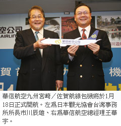 慶祝首航記者會當日,華信航空總經理王華宇偕同11家旅遊業者出席盛會,王華宇開心回顧華信一路走來的風光;他表示,華信航空在2000年以優異的飛安爭取到第3個國籍航空飛往日本包機的殊榮,5年來飛日包機多達31點,航線遍佈北海道、本州、四國、九州、琉球等地,不僅是台北、高雄有包機,就連澎湖、台中、花蓮等地也有,華信航空無疑是為台日交流開啟大門;而九州優質的知性之旅向來深受國人青睞,華信的包機從佐賀/宮崎進出,將整個九州南、北遊程串連,不論由南進北出或是北進南出,均不需走回頭路,玩家或是操團的業者都可在有限的旅遊天數暢遊九州精華景點。