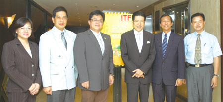 ▲ (左起)台北國際旅展執行長葉碧華、觀光局國際組副組長趙光訓╱組長劉喜臨、台北國際旅展籌委會主委嚴長壽、ANTOR會長施春庭、觀光局企劃組副組長兼公關室主任楊永盛。