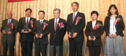 ▲ 台灣觀光協會名譽會長暨台北國際旅展主任委員嚴長壽(左4)頒發感謝牌表揚熱心參與2008國際觀光推廣活動的單位,(左起)台北福華大飯店、涵碧樓大飯店、亞都麗緻旅館系統、台灣休閒農業發展協會、六福村主題遊樂園、真愛婚禮有限公司、維格餅家有限公司。