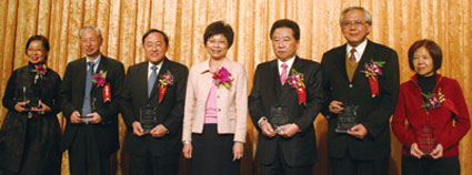 ▲ 觀光局局長賴瑟珍(左4)頒贈感謝牌表揚熱心參與2008國際觀光推廣活動之個人,(左起)金界旅行社董事長張李正琴、假日旅行社董事長王振銘、中信旅行社董事長章致遠、陽達旅行社董事長楊重義、台北清真大寺董事長馬超彥、蘋果旅遊有限公司社長拿督李益輝。
