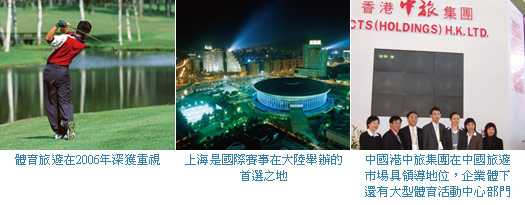 中國為世界體育強國之一,相對的體育項目在中國市場深度與廣度都非常驚人,單從世界一級體育品牌在內地激烈競爭,以及風靡世界的體育人才,都突顯出中國體育的強盛。因此,體育結合旅遊的發展,成為中國旅遊市場另一個主流,不管是Inbound與Outbound的收益都非常可觀,再加上2008北京奧運盛會推波助瀾,體育旅遊的風潮會更加蓬勃。