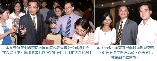 ▲(左起)長榮航空新竹業務代表周春福、營業一課楊貴欽、廣州籌備處客運代表劉聰維、桃園服務站曾春華、永東集團主席連忠輝、長榮航空中國華南地區首席代表香港分公司總主任林志忠、香港分公司客運課何汝奇、台中辦事處楊玉貞、立榮航空台中辦事處課長許智雄、營業本部高雄營業部國際營業課廖秋雯。