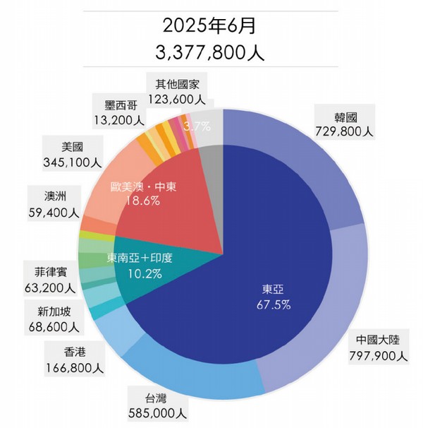 根據日本觀光廳最新統計,2025年上半年訪日外國旅客人次達2,151萬8,100人次,較去年同期成長逾370萬人,創下史上最快於半年內突破2,000萬人次紀錄。單6月更吸引337萬7,800人次來日,年增率達7.6%,創歷年6月新高,包括美國、韓國、台灣、新加坡等在內的15個市場,同樣刷新歷年6月訪日人次紀錄。其中,受惠於台北-新千歲、高雄-福岡等航線增班及郵輪停靠港口增加等利多因素,台灣旅客上半年赴日總人數達328萬4,700人次,年增10.3%,在亞洲市場中表現亮眼,也讓航空與旅行社提早布局、坐享秋季「紅」利。