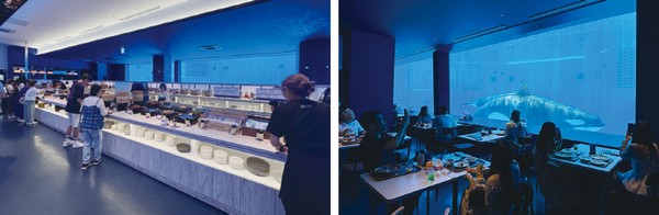 想體驗一邊用餐、一邊欣賞虎鯨優雅泳姿的獨特時光,千萬別錯過館內自助餐廳「BLUE OCEAN」。餐廳採完全預約制,建議事先預約用餐時段,以確保可安排觀賞席位。這裡設有面向虎鯨水槽的觀賞座位,能在取餐時看到虎鯨悠游姿態,宛如與牠們共餐。餐廳以海藍與沙白為主色調,明亮開闊的空間營造出海洋度假氛圍,料理嚴選兵庫縣與關西地區食材,提供豆乳刷刷鍋、鮮魚握壽司、烤牛肉與豬肉等多樣美味。