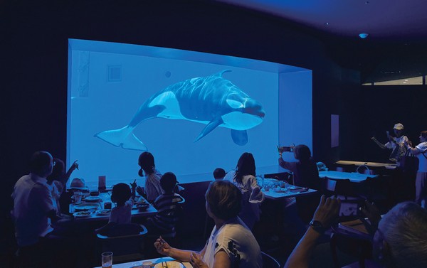 ▲虎鯨館自助餐廳「BLUE OCEAN」具備大型水槽,事前預約就有機會在虎鯨陪伴下享用美食。