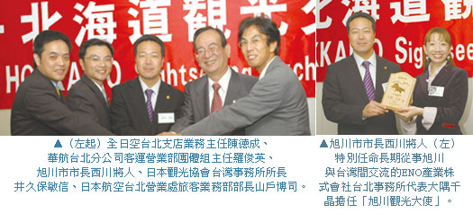 擔任本次訪問團團長的旭川市市長西川將人則表示,「旭川市為北海道僅次於札幌的第二大都市,多年以來感謝各家航空公司以包機方式送客到旭川,而此次來台除了推廣道北地區的觀光外,也希望能夠拓展包括旭川以及稚內地區的包機業務,對於道北地區的產品包裝也將更有助益。」在介紹自家觀光部分西川將人指出,以旭川最受歡迎的人氣景點旭川動物園所拍攝的電影「旭川動物園物語」即將於明年春天上映,此外包括旭川冬祭、冰雕大會、雪光節以及冰瀑節節等盛會也將於明年2月陸續舉辦,冬天也是最能夠感受濃濃北海道風情的季節。本次活動除了各個行政區首長均躬逢其盛外,也帶來許多豐富的北海道物產加以推廣。
