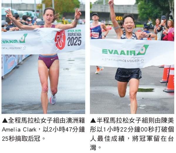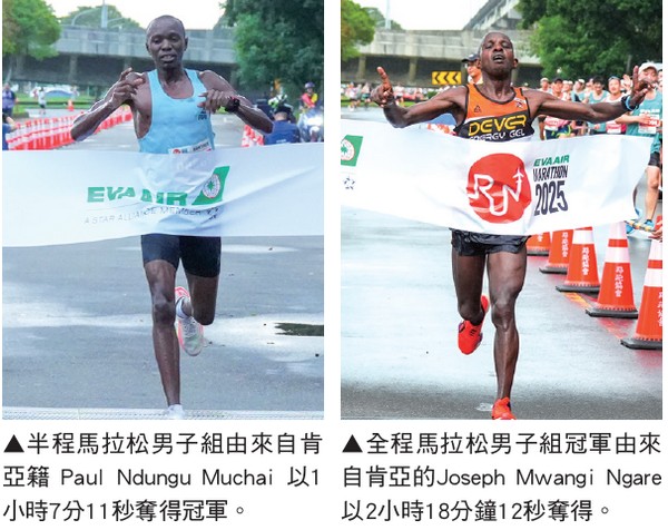 今年戰績非常精彩,全程馬拉松男子 組冠軍由肯亞籍Joseph Mwangi Ngare以2 小時18分鐘12秒奪得。全程馬拉松女子 組部分則由澳洲籍Amelia Clark,以2小時 47分鐘25秒摘取后冠。而年初國道馬拉 松衝出全程馬拉松第2的好成績的市民 跑者張景敦,以2小時40分鐘48秒,奪 下全馬國內男子組第1,與全馬國內女 子組冠軍李惠娟各獲得長榮航空特別加 碼1張全球不限航點經濟艙機票。