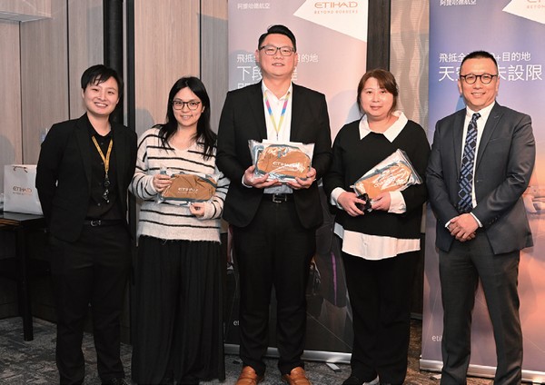▲(左起)金界旅運集團訂位票務副理李如軒、副總經理張詩蕾、阿提哈德航空資深客戶經理張俊雄、客戶經理林孟樵、金展旅行社總經理凌維謙。