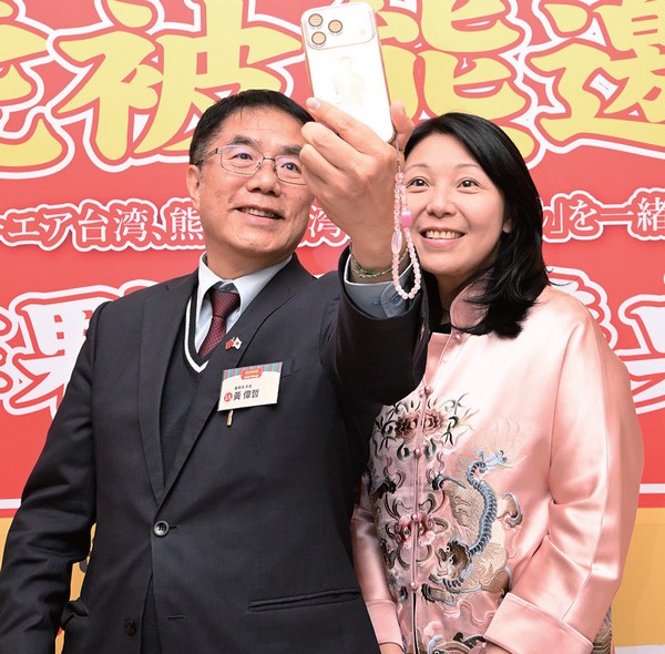 ▲超台的辦桌囍事模式,讓台南市市長黃偉哲與台灣虎航董事長黃世惠興奮自拍合影。