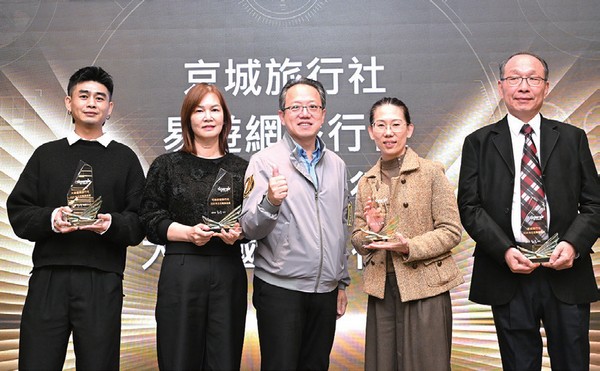 ▲台灣虎航商務長暨發言人許致遠(中)頒發500萬美金獎給予大榮國際旅行社、可樂旅遊、易遊網、京城旅行社。