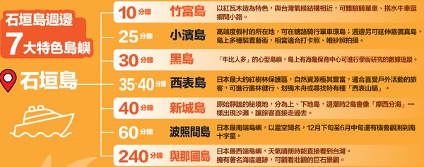 來到石垣島,怎麼能不把週邊島嶼一起玩一遍呢!作為八重山群島的交通樞紐,石垣島成為跳島門戶角色,距離週邊離島船程短、特色分明,適合規劃多元海陸體驗以及親子慢活行程。在海洋資源上,當地具有豐富的珊瑚生態、清澈海水及細白沙灘,可進行浮潛、深潛、SUP、橡皮艇、玻璃船等水上活動;陸上則有騎馬、ATV四輪傳動車、單車漫遊等活動,而最特別的空中活動,將安排直升機、動力飛行傘體驗,帶旅客從空中俯瞰島嶼的迷人姿態。另外還特別推薦陶燒、漆器、觀星、藍染、編織等課程,以及品嚐如石垣牛、蕎麥麵、湯豆腐、黑糖等在地美食,來增添旅程豐富度與深度體驗性。