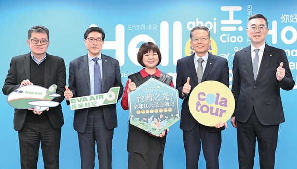 ▲(左起)可樂旅遊董事總經理陳政宏、長榮航空首席副總經理廖至維、可樂旅遊董事總經理謝雲苗、長榮航空總經理孫嘉明、客運營業本部副總經理王振興。