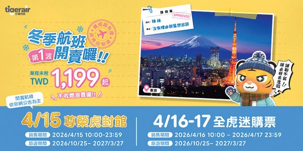 台灣虎航於4/10宣布將於4/15開賣2026冬季航班,並針對符合尊榮虎(tigerprime)資格的會員,提供優先搶購的專屬權利。尊榮虎優先搶票日:4/15上午10:00~23:59止;全員開賣期間為4/16上午10:00起至4/17晚間23:59止。首波促銷航線包括:桃園-濟州島、高雄-首爾金浦、桃園/高雄-沖繩那霸、桃園-首爾仁川、桃園-釜山、桃園/高雄-大阪關西、桃園/高雄-福岡、桃園-宮崎、桃園-佐賀、桃園-岡山、桃園/高雄-東京成田、桃園-東京羽田、桃園/台中/高雄-名古屋、桃園-小松、桃園/高雄-仙台、桃園-新潟、桃園-花卷、桃園-札幌、桃園-函館、高雄-札幌。本次推出的優惠價格皆為單程未稅價,促銷搭乘期間為10/25~2027/3/27。