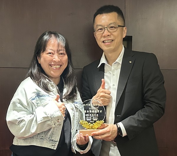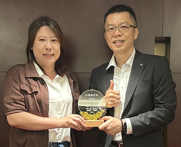 ▲華信航空總經理莊明哲(右)頒發「仟萬台幣績優業者」獎座給予雄獅旅行社副總經理洪碧玲(左)。