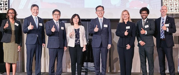 ▲桃園機場與華盛頓機場簽署姊妹機場合作備忘錄。(左起)美國在台協會(AIT)商務組組長歐潔(Janée Pierre-Louis)、桃園機場公司總經理范孝倫、董事長楊偉甫、民航局局長何淑萍、交通部次長林國顯、華盛頓機場管理局執行副總暨財務長Chryssa Westerlund、副總Paul Bobson、美國在台協會(AIT)商務官柯思遠(Christian Koshil)。