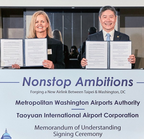 桃園國際機場公司(TIAC)與華盛頓機場管理局(Metropolitan Washington Airports Authority,MWAA)於9╱18晚間在美國在台協會商務組組長歐潔(Janée Pierre-Louis)見證下,簽署姊妹機場合作備忘錄,由機場公司總經理范孝倫,與華盛頓機場管理局執行副總暨財務長Chryssa Westerlund共同代表簽署,華盛頓機場成為桃園機場第17個友好機場,為台美雙方深化合作關係,開啟嶄新篇章。