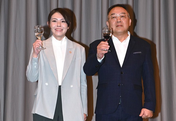 ▲(左起)新竹市市長高虹安、新竹市旅行公會理事長江百松。