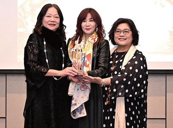 ▲木蘭隊會長交接儀式在第26屆會長駱炫宏(中)監交下,由27屆會長吳碧蓮(左)接棒給28屆會長許素珍(右)。