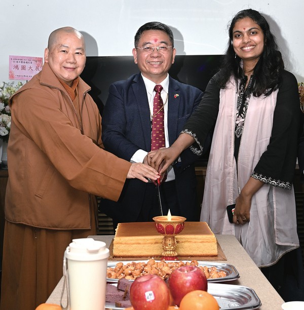 ▲(左起)世界佛教協會聯合會理事長明毓法師、世群旅行社董事長葉庭林、台北印度協會副會長偉敏慧。
