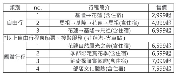 此次產品同步推出馬祖與花蓮串聯行程,依不同出發地與交通組合,規劃3至4日自由行產品。4日行程採馬祖出發,經基隆前往花蓮,再返回馬祖,完整串聯馬祖離島與東部路線,出發日期為7/3及8/7,含1晚花蓮精選飯店。3日行程則由花蓮出發,自花蓮港搭新台馬輪經基隆再前往馬祖;回程安排搭機返回松山機場,兼顧移動效率與旅遊體驗,出發日期為7/5及8/9,含1晚馬祖精選民宿。
