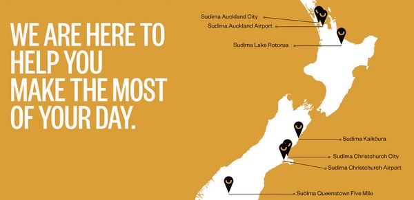 作為紐西蘭當地的高端飯店集團,Sudima Hotels旗下飯店遍布全國,舉凡奧克蘭機場、奧克蘭市中心、羅托魯瓦湖畔、基督城機場、基督城市中心、皇后鎮及凱庫拉等熱門旅遊目的地,都能享受到Sudima Hotels所提供的完美住宿服務。
