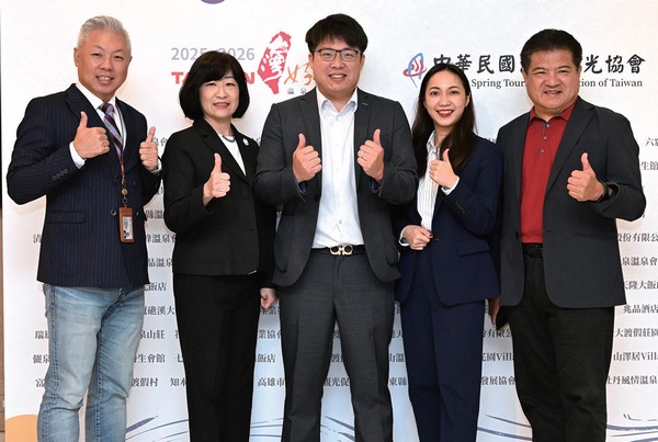 ▲(左起)福容大飯店福隆總經理戴瑞宏、力麗觀光集團董事長楊竫如、溫泉觀光協會理事長李浩瑋、知本金聯世紀酒店董事長楊子嫻、溫泉觀光協會榮譽理事長李吉田。