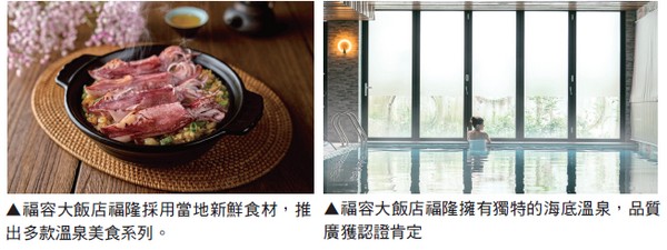 福容大飯店福隆擁有得天獨厚的海底溫泉,泉質屬「氯化物氫鹽泉」,獲新北市政府溫泉認證,泉源取自枋腳斷層地底下1,500公尺,泉水呈淡琥珀色,入浴後能在皮膚形成保濕薄膜,鹽分附著減緩冷卻並防止汗水蒸發,2024年更榮獲「世界奢華水療獎」溫泉飯店殊榮,象徵其獨特品質。飯店亦同步推出溫泉美食系列,結合東北角漁獲、貢寮米與雙溪山產,展現地方特色,並榮獲新北市政府美食名店肯定,將道地滋味呈現給全台旅客。