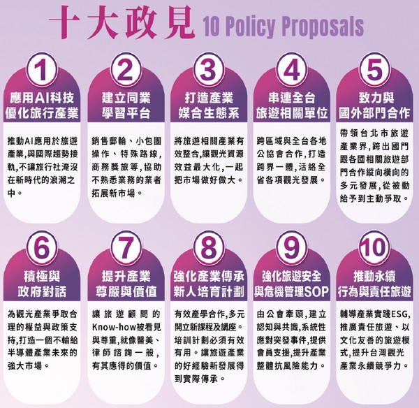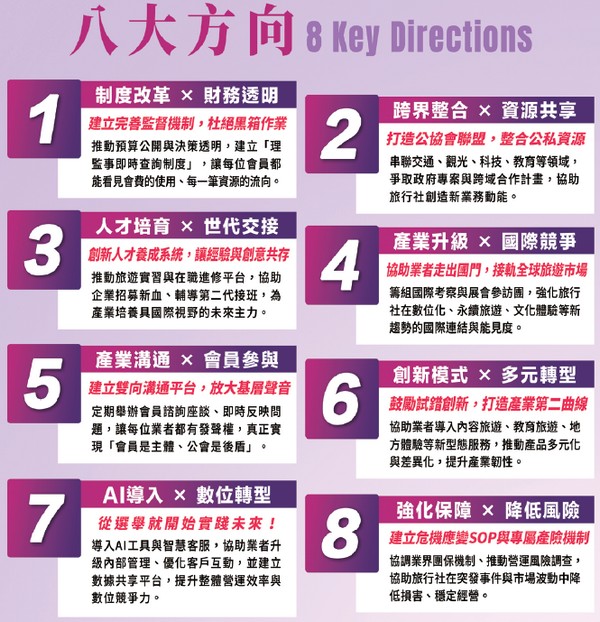 陳怡璇指出,未來3年將以「強化內部功能、爭取外部資源、推動產業改革」為核心方向,帶領公會邁向國際化。她表示,過去一屆公會各專業委員會功能發揮有限,未能有效推動如歐美、日韓、東南亞、郵輪、兩岸等旅遊路線的發展。未來,將從內部自我提升做起,強化委員會職能,並讓其在產業推動中發揮更大作用。